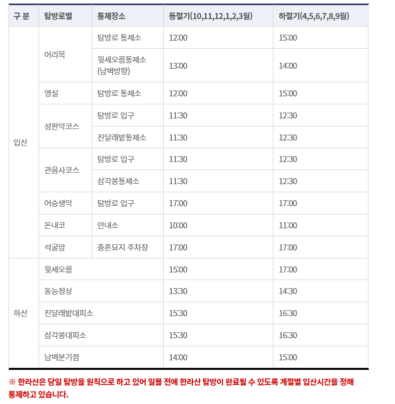 ● 성판악탐방로 입구 하절기 12:30, 동절기 11:30부터, 진달래밭통제소 하절기 12:30, 동절기 11:30 정상 탐방 통제